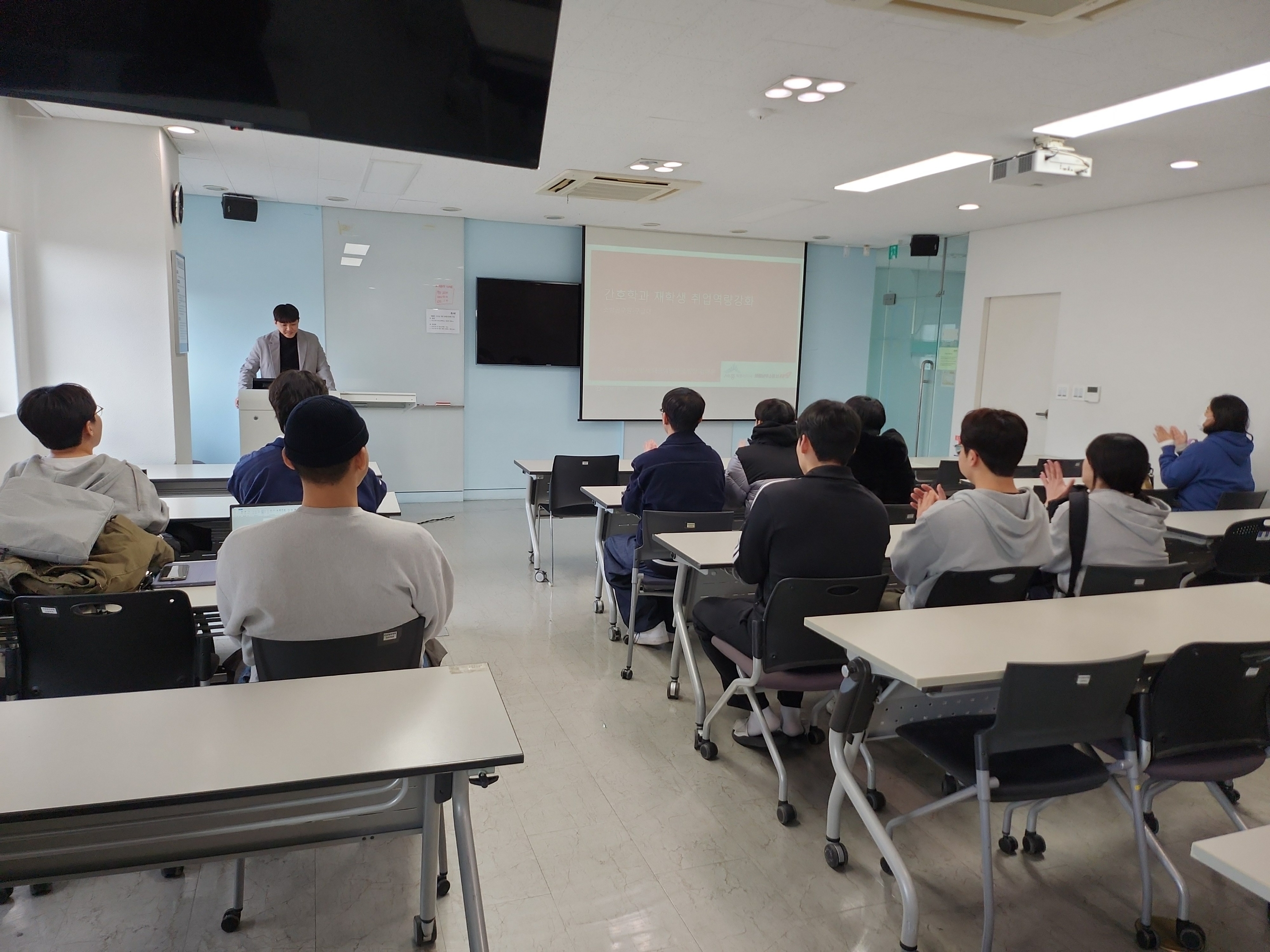커뮤니티 학생활동 공지사항 자유게시판 명장프로그램 간호계 동향 포토갤러리 영상갤러리 취업정보 취업게시판 관련사이트 Home커뮤니티포토갤러리 포토갤러리 2025-2학기 산업체 인사 초청 특강_간호사 특채 소방공무원 카테고리 : | 작성자 : 학과관리자 | 작성일 : 2026.01.14 | 조회수 : 33 2025.11.12 간호사의 직무에 대한 이해를 높이고, 특히 간호 관련 공무원에 대한 높은 직업 선호도를 반영하여 간호사 특채 소방공무원의 준비 방법과 현장 근무에 대한 이해를 돕는 시간을 마련하고자 하였습니다. 본 프로그램은 다음과 같은 내용을 중심으로 구성되었습니다. 신규 간호사의 실무 적응을 위한 바람직한 직업 태도 형성 성공적인 소방공무원 합격을 위한 준비 전략 및 과정 안내 소방공무원으로서 수행하는 간호직무의 실제 현장과 근무조건 소개 이를 통해 학생들은 간호사의 다양한 진로를 구체적으로 이해하고, 공공의료 및 재난 대응 분야에서 요구되는 간호사의 역할과 역량을 체계적으로 살펴보는 의미 있는 시간을 가질 수 있었습니다. 첨부파일 KakaoTalk_20251112_140226426.jpg KakaoTalk_20251112_140226426_03.jpg 목록